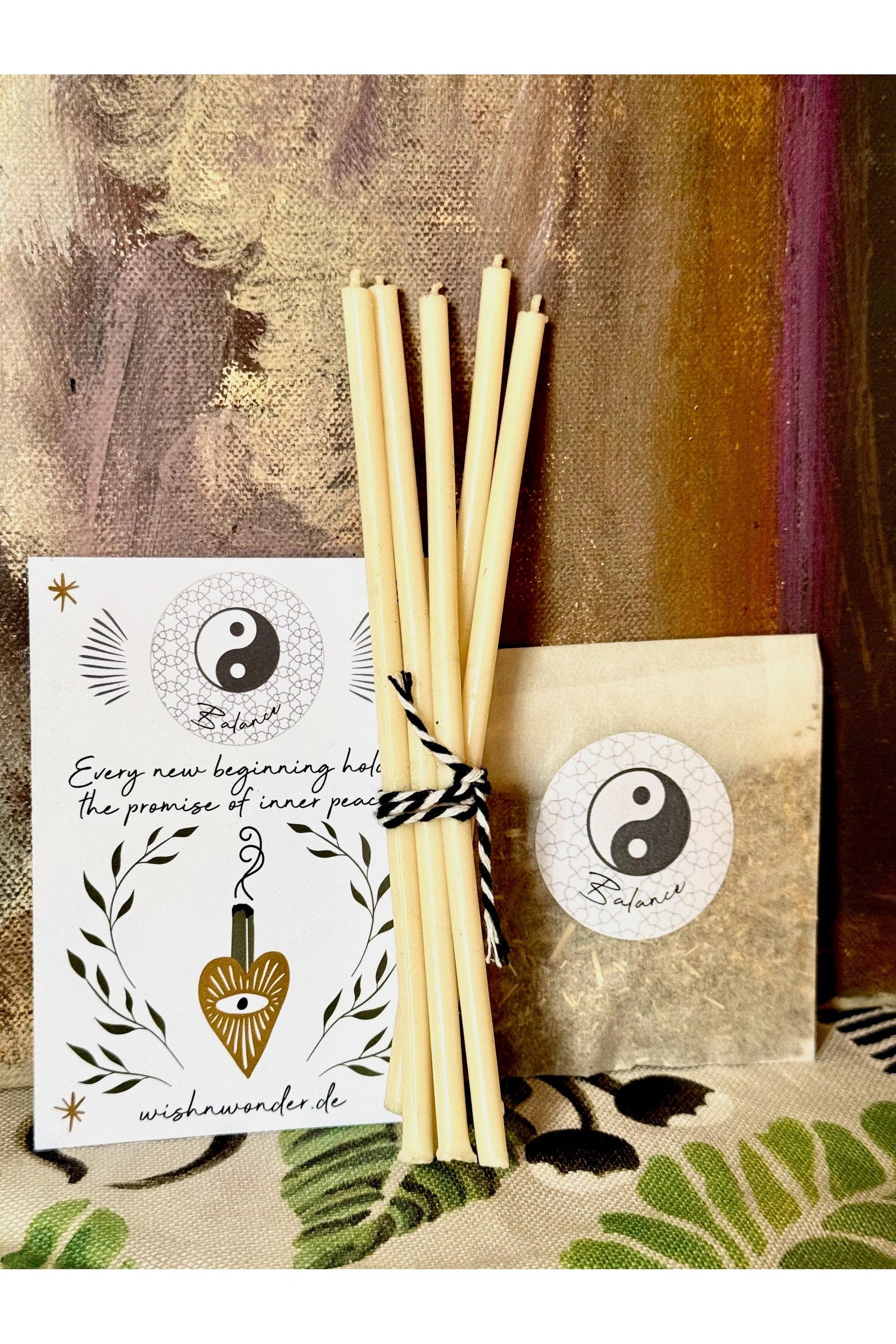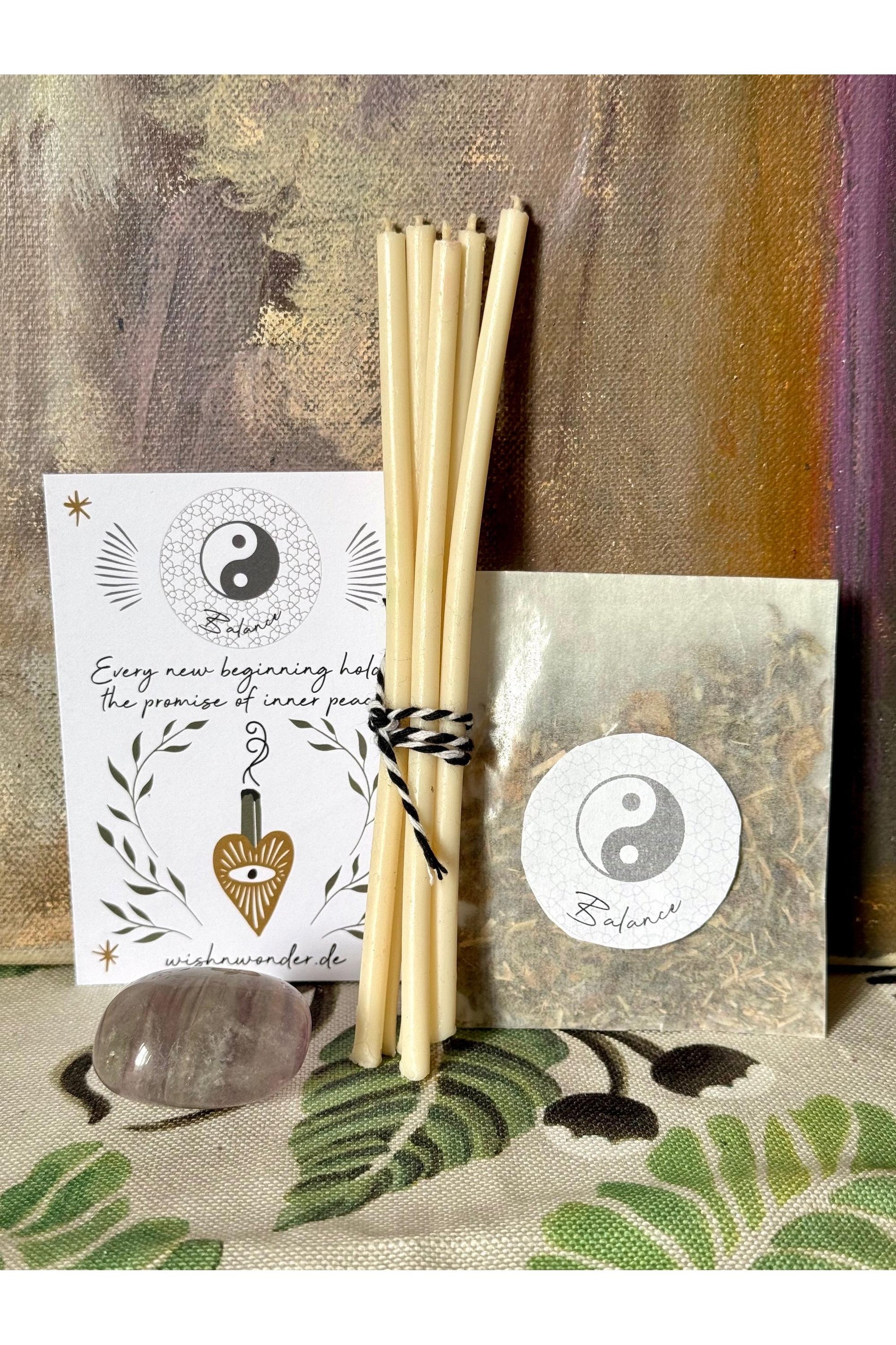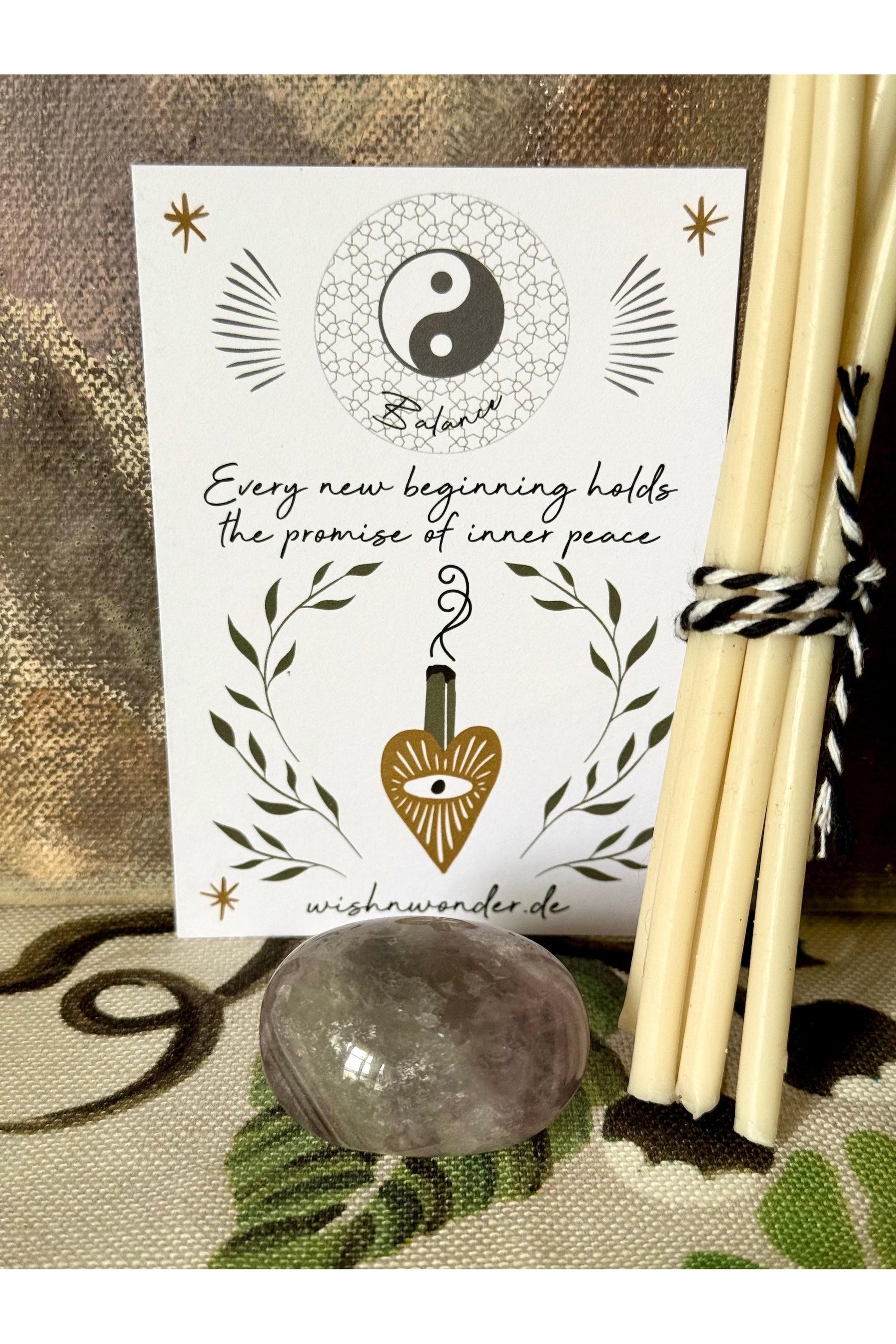 A candle ritual set with the matching herb mixture for incense and the supporting healing stone as superpower.
