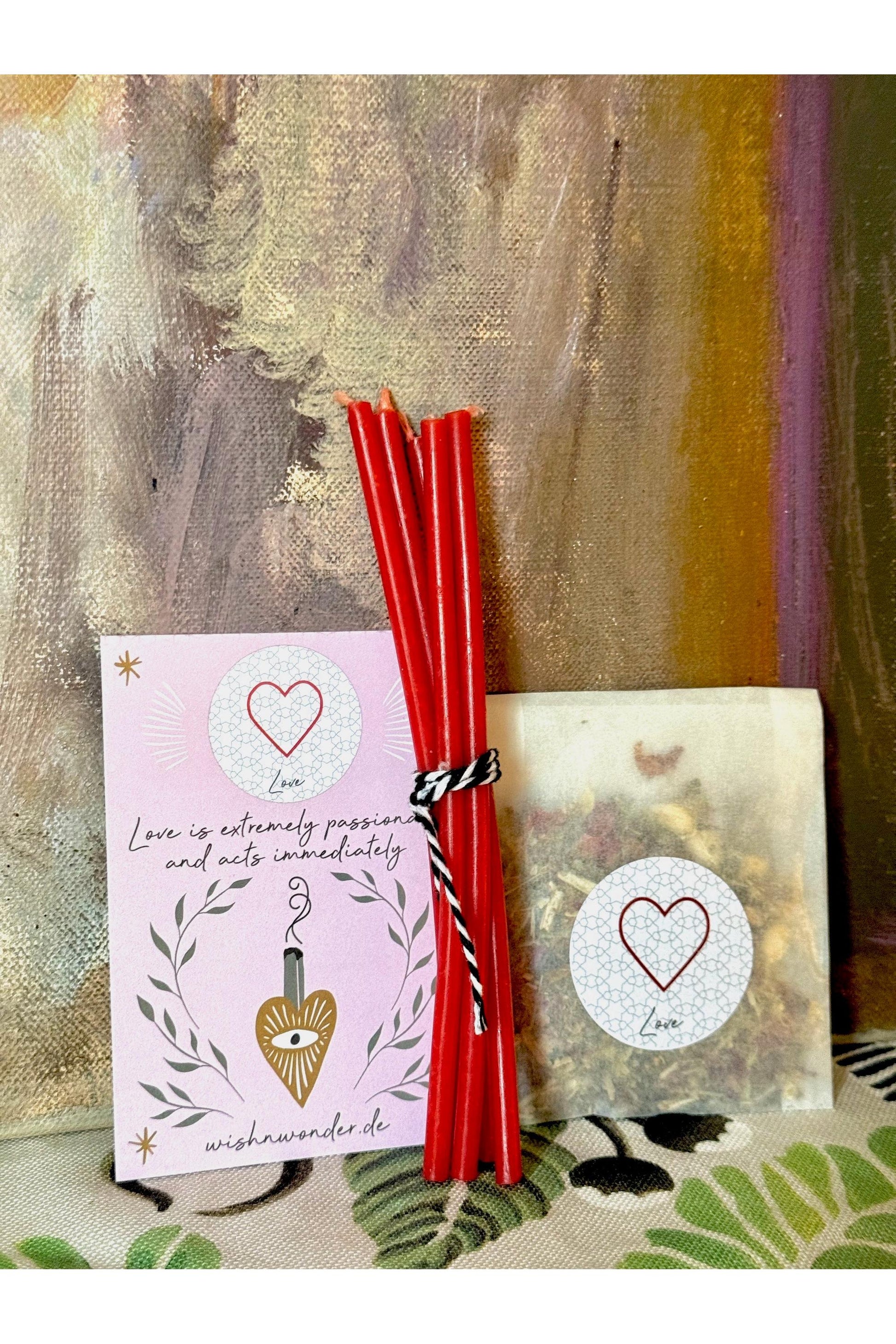 I light the red candle and I feel warmth and love awakening within me. The scent of the herbs calms me, the rose quartz opens my heart. I am filled with love – for myself and for the world.