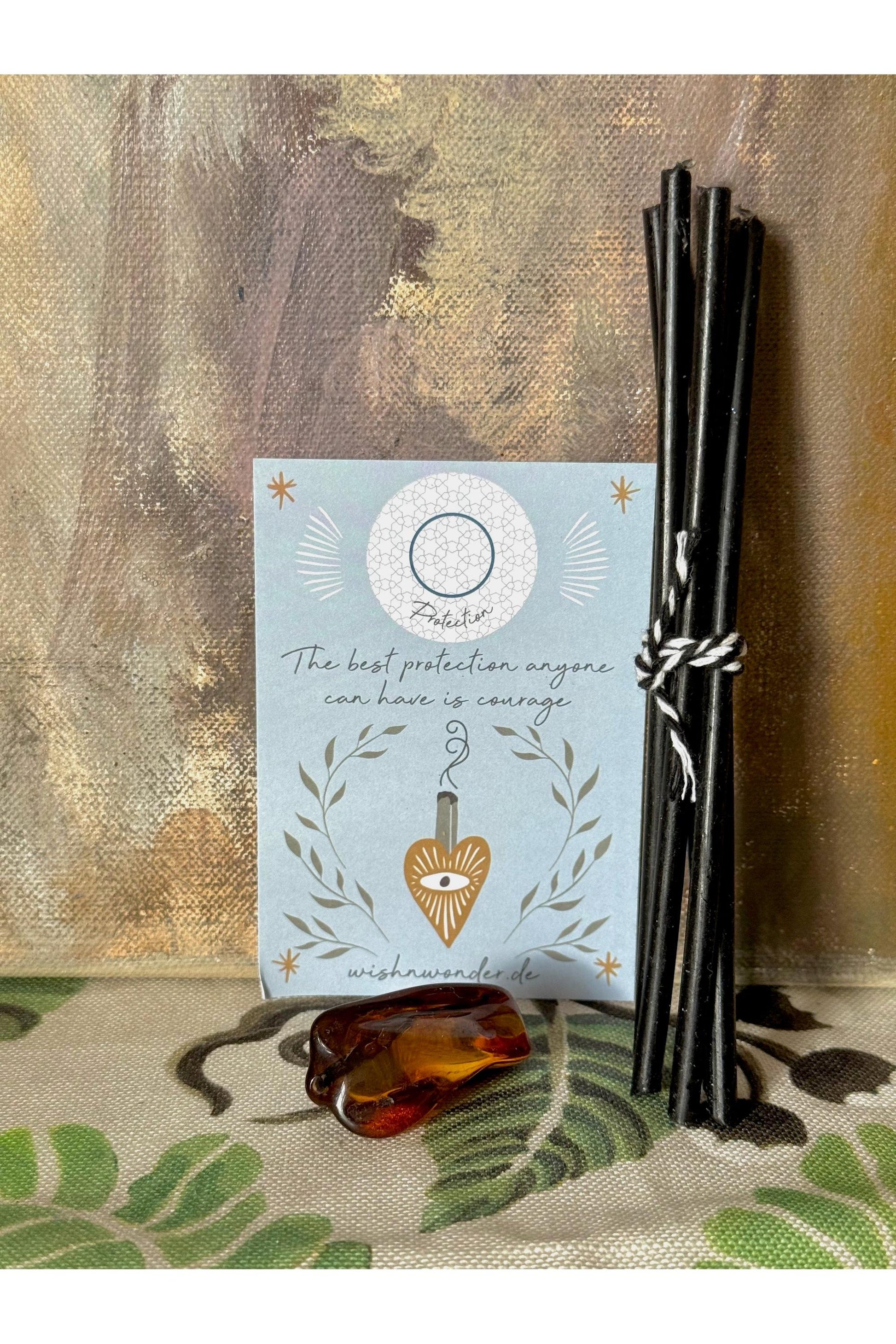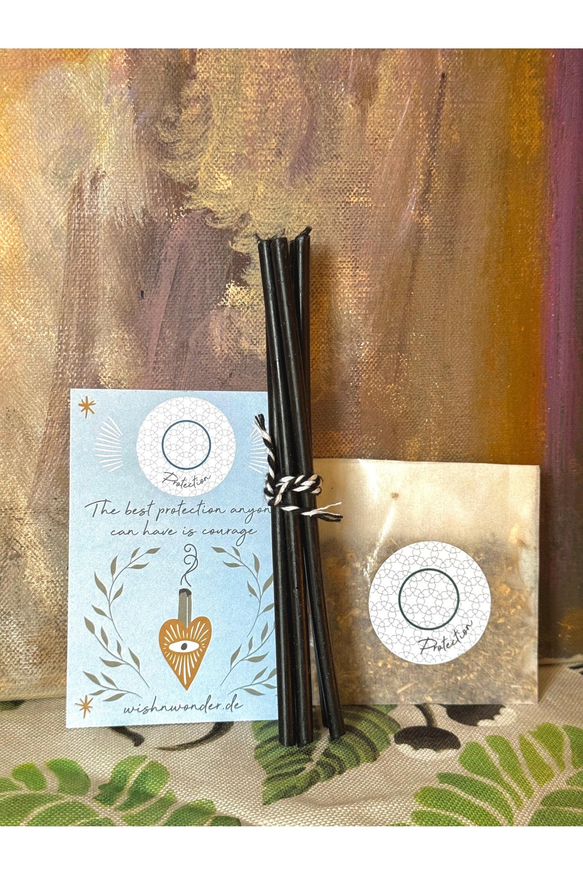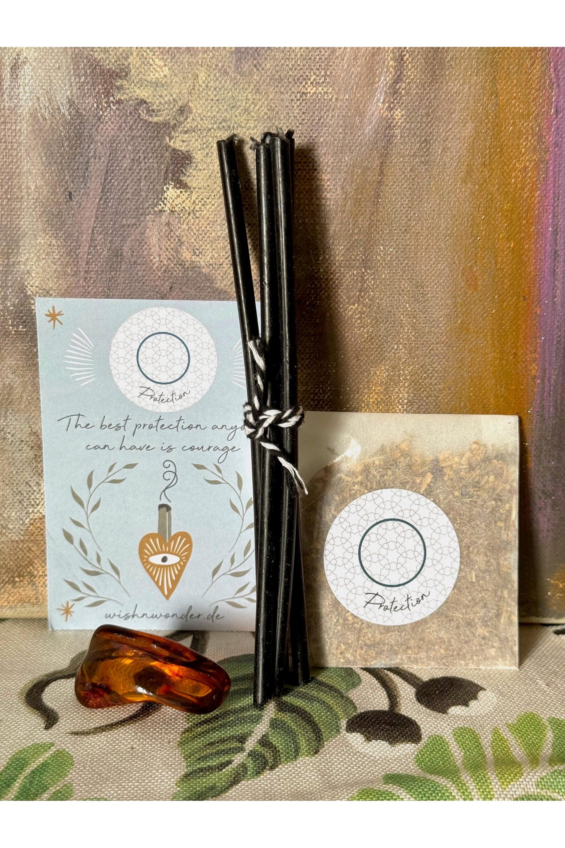 A candle ritual set with the matching herb mixture for incense and the supporting healing stone as superpower.