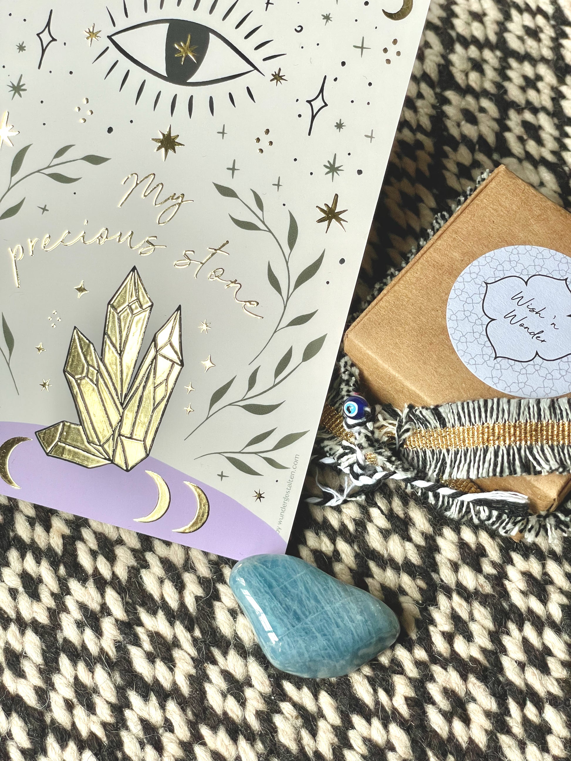 Ein Aquamarin persönlich ausgesucht, gereinigt und mit positiver Energie aufgeladen. Begleitet wird er von einer wunderhübsch illustrierten Karte mit den Eigenschaften - der "Magie" - des Steines und für welches Chakra er hauptsächlich eingesetzt wird. Zusätzlich findest Du auch Pflegehinweise für den Halbedelstein.