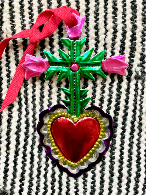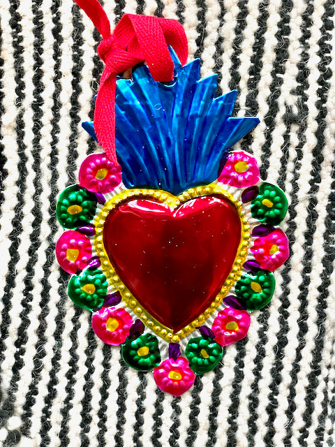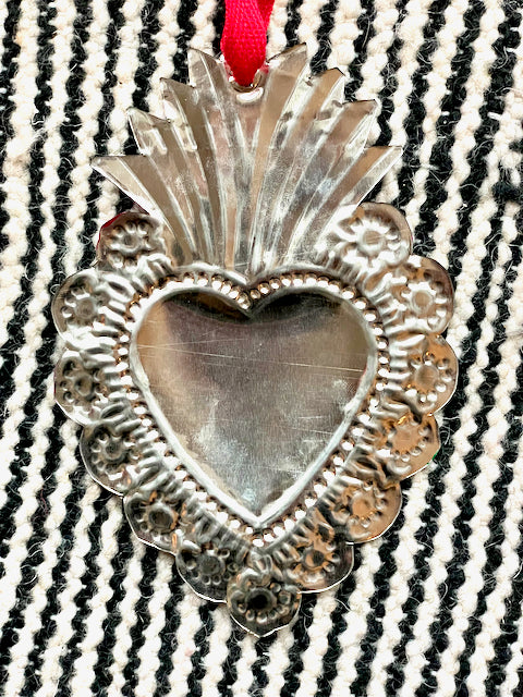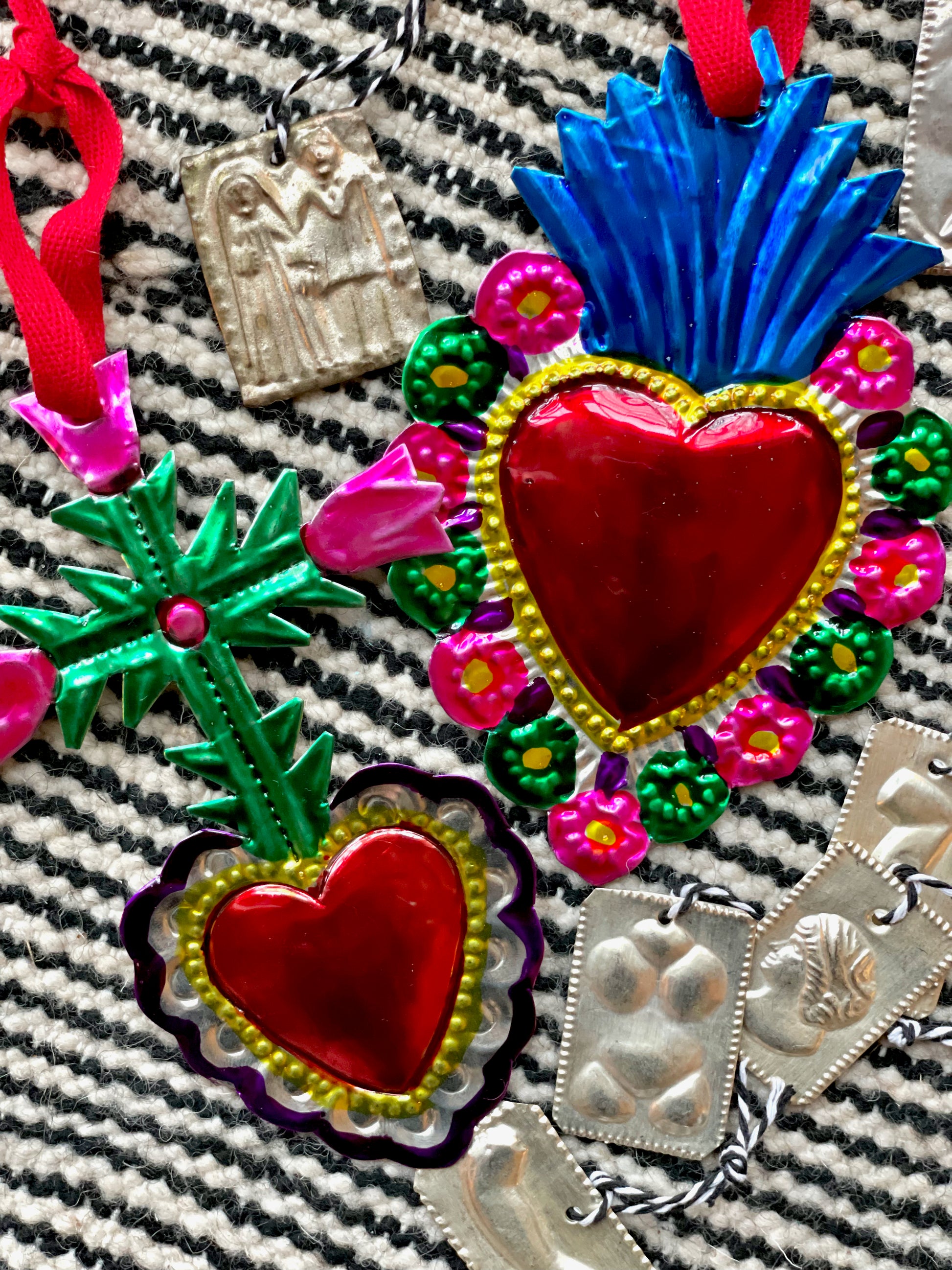 Ein Blechherz aus gestanztem Weißblech, handbemalt in Oaxaca, Mexiko.