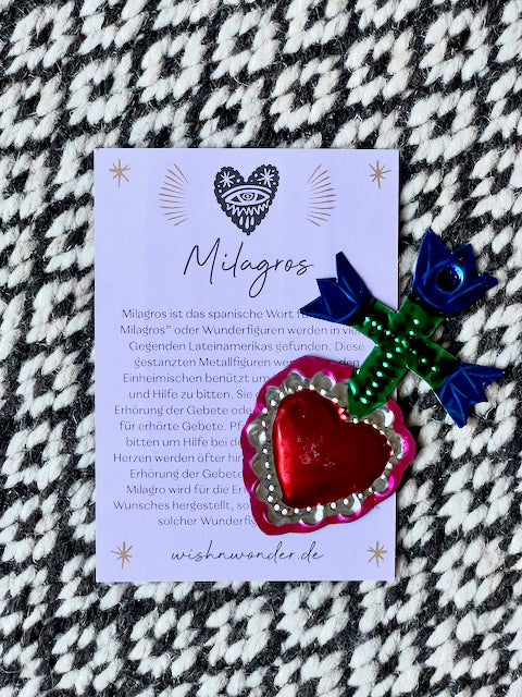 Milagros ist das spanische Wort für "Wunder". Milagros” oder Wunderfiguren werden in vielen Gegenden Lateinamerikas gefunden. Diese gestanzten Metallfiguren werden von den Einheimischen benützt um Heilige um Schutz und Hilfe zu bitten. In vielen Kirchen kann man hölzerne Statuen von Heiligen wie die heilige Jungfrau oder Christus sehen. Die Leute stecken kleine Abbildungen z. B. von Armen, Beinen, Tieren, betenden Figuren und vielen anderen Symbolen ihrer Gebete und Hoffnungen an diese Statuen. Diese Figuren dienen der besseren Erhörung der Gebete oder drücken den Dank aus für erhörte Gebete. Pferde- oder Lammfiguren bitten um Hilfe bei der Heilung kranker Tiere oder bitten um Fruchtbarkeit. Studenten hinterlassen offene Bücher, welche die Heiligen um göttliche Intervention bei ihren Zensuren bitten sollen. Herzen werden öfter hinterlassen als Dank für die Erhörung der Gebete von Verliebten. Jedes Milagro wird für die Erfüllung eines speziellen Wunsches hergestellt, so dass eine riesige Vielfalt solcher Wunderfiguren entsteht