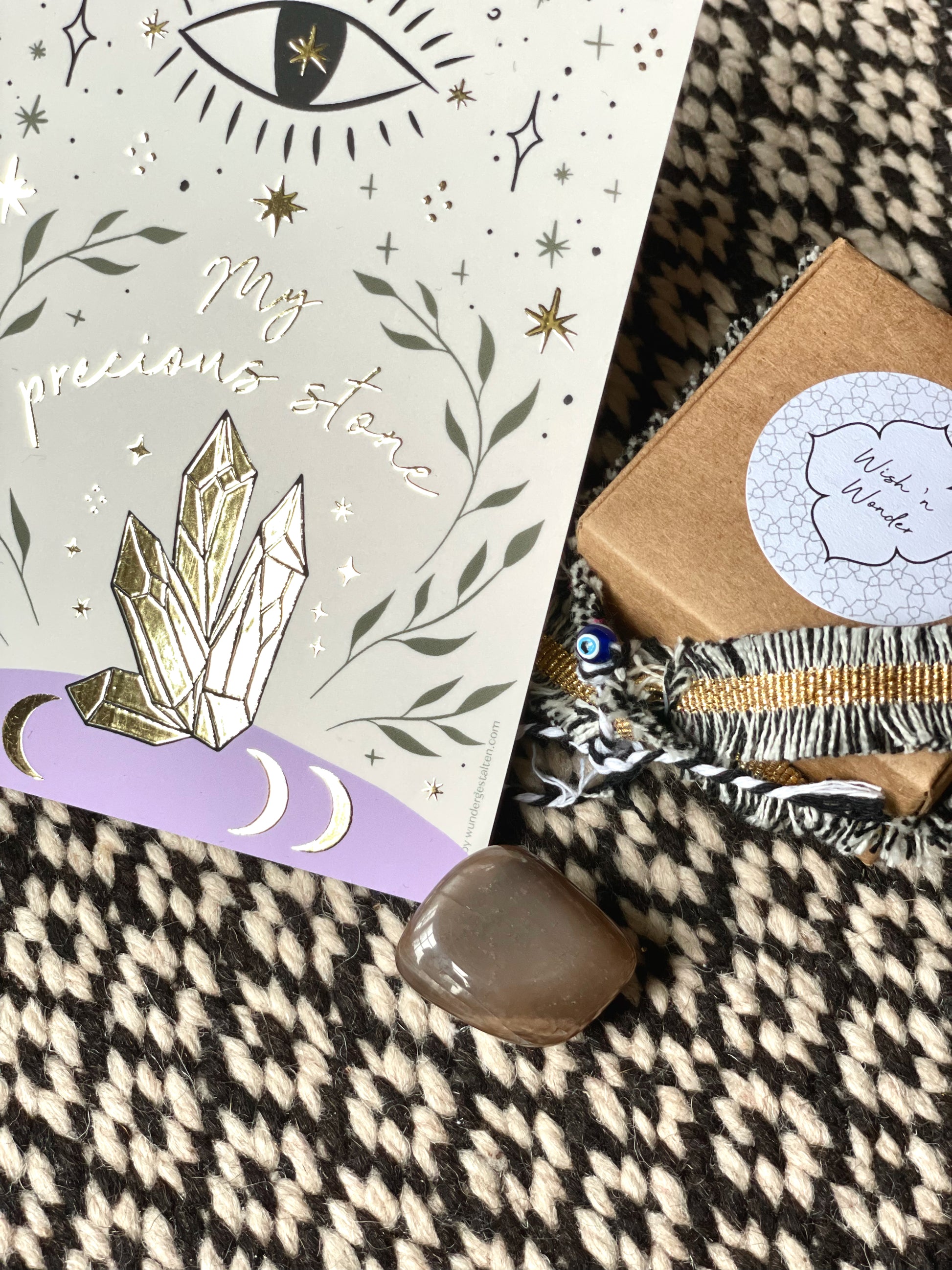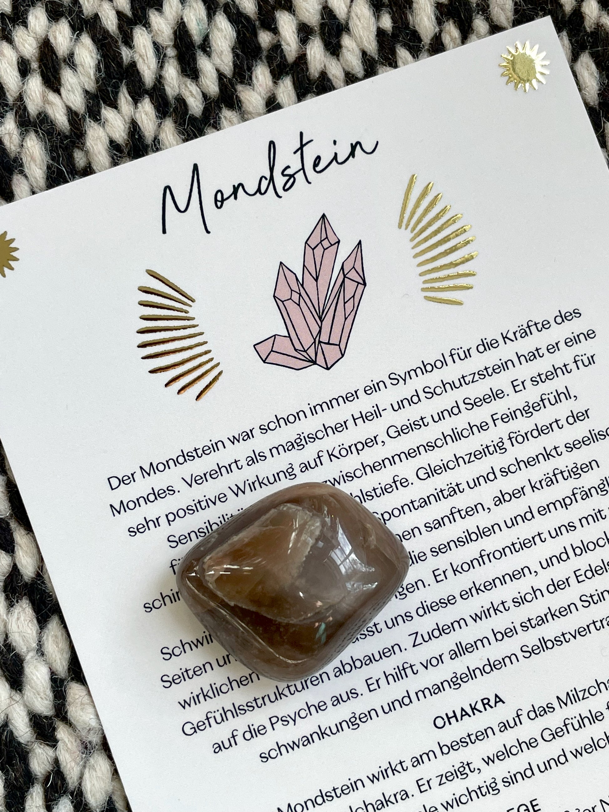 Ein Mondstein persönlich ausgesucht, gereinigt und mit positiver Energie aufgeladen. Begleitet wird er von einer wunderhübsch illustrierten Karte mit den Eigenschaften - der "Magie" - des Steines und für welches Chakra er hauptsächlich eingesetzt wird. Zusätzlich findest Du auch Pflegehinweise für den Halbedelstein.