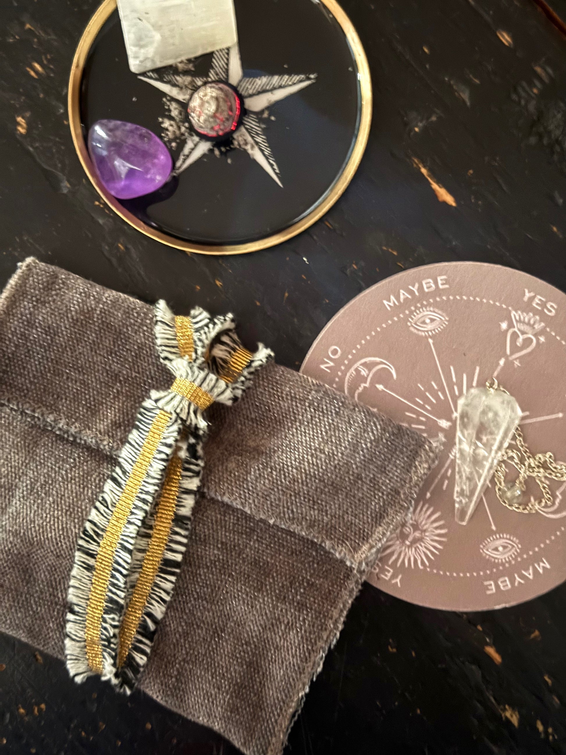 Das Pendelset kommt in einem kleinen, handgenähten Stoffbeutel und beinhaltet:
