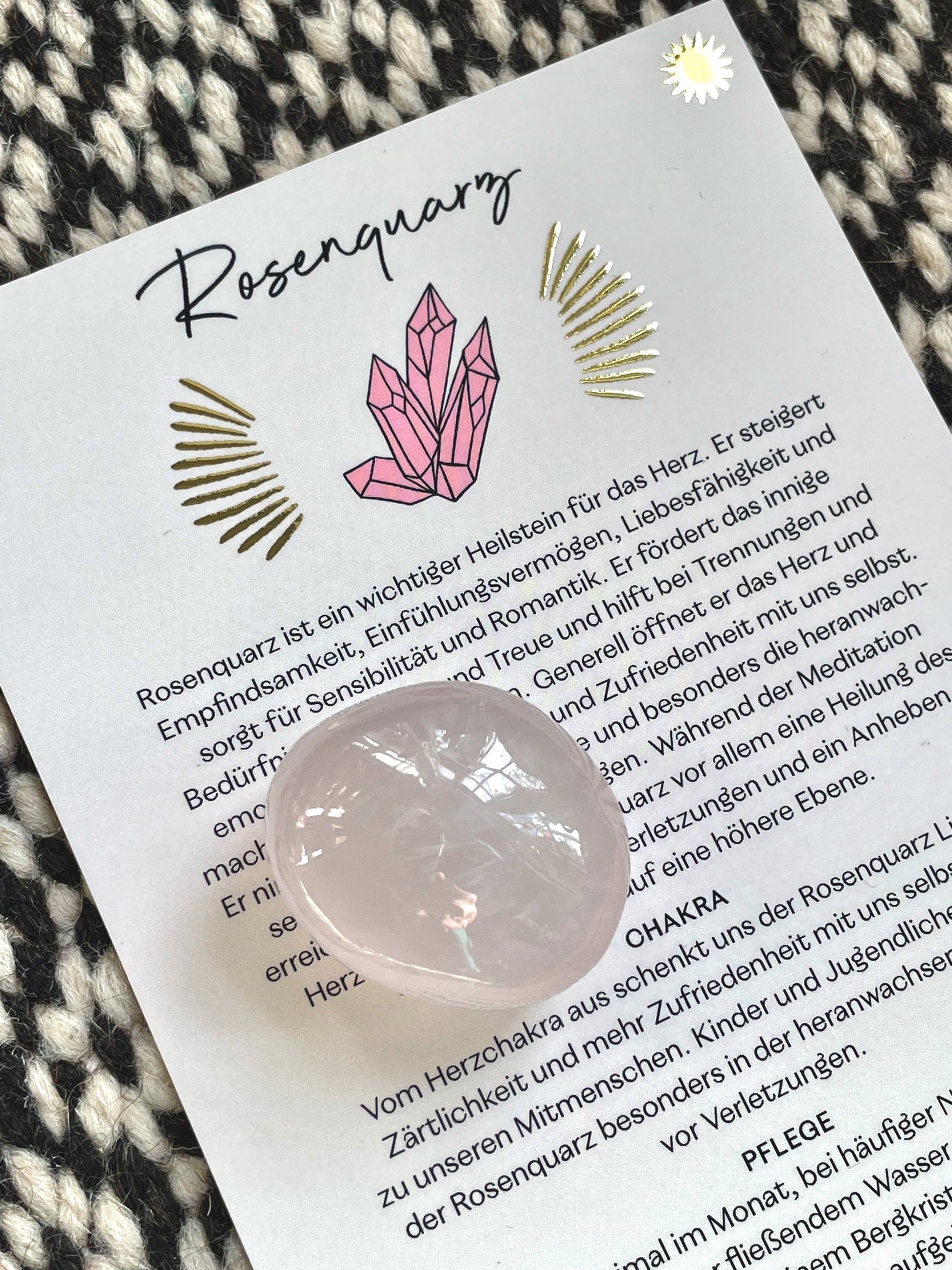 Ein Rosenquarz persönlich ausgesucht, gereinigt und mit positiver Energie aufgeladen. Begleitet wird er von einer wunderhübsch illustrierten Karte mit den Eigenschaften - der "Magie" - des Steines und für welches Chakra er hauptsächlich eingesetzt wird. Zusätzlich findest Du auch Pflegehinweise für den Halbedelstein.