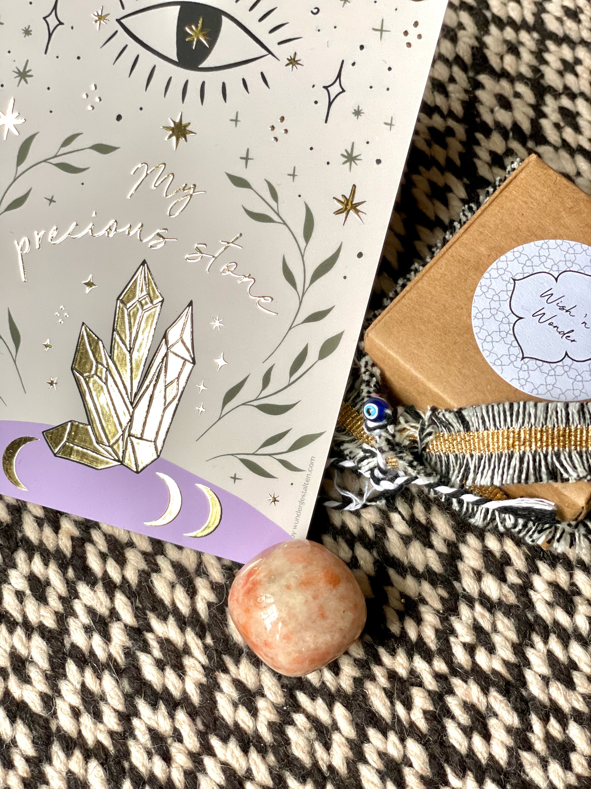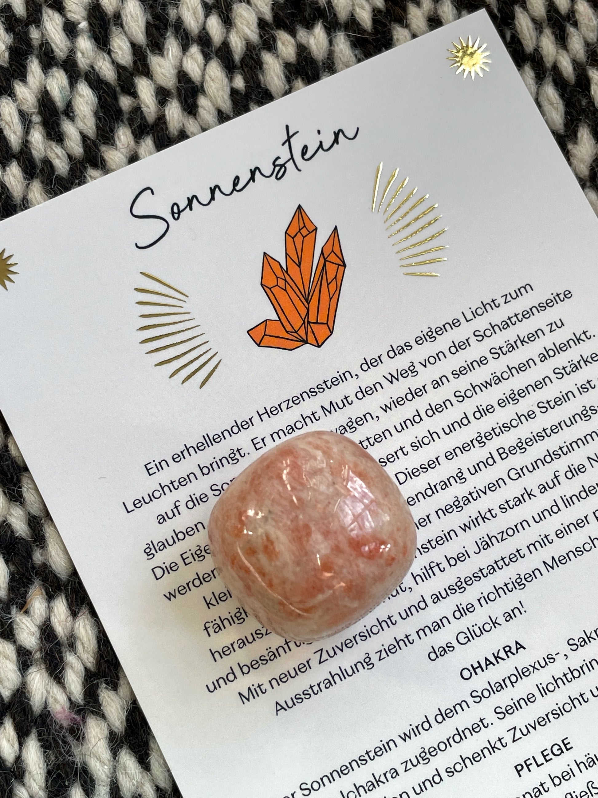 Ein Sonnenstein persönlich ausgesucht, gereinigt und mit positiver Energie aufgeladen. Begleitet wird er von einer wunderhübsch illustrierten Karte mit den Eigenschaften - der "Magie" - des Steines und für welches Chakra er hauptsächlich eingesetzt wird. Zusätzlich findest Du auch Pflegehinweise für den Halbedelstein.