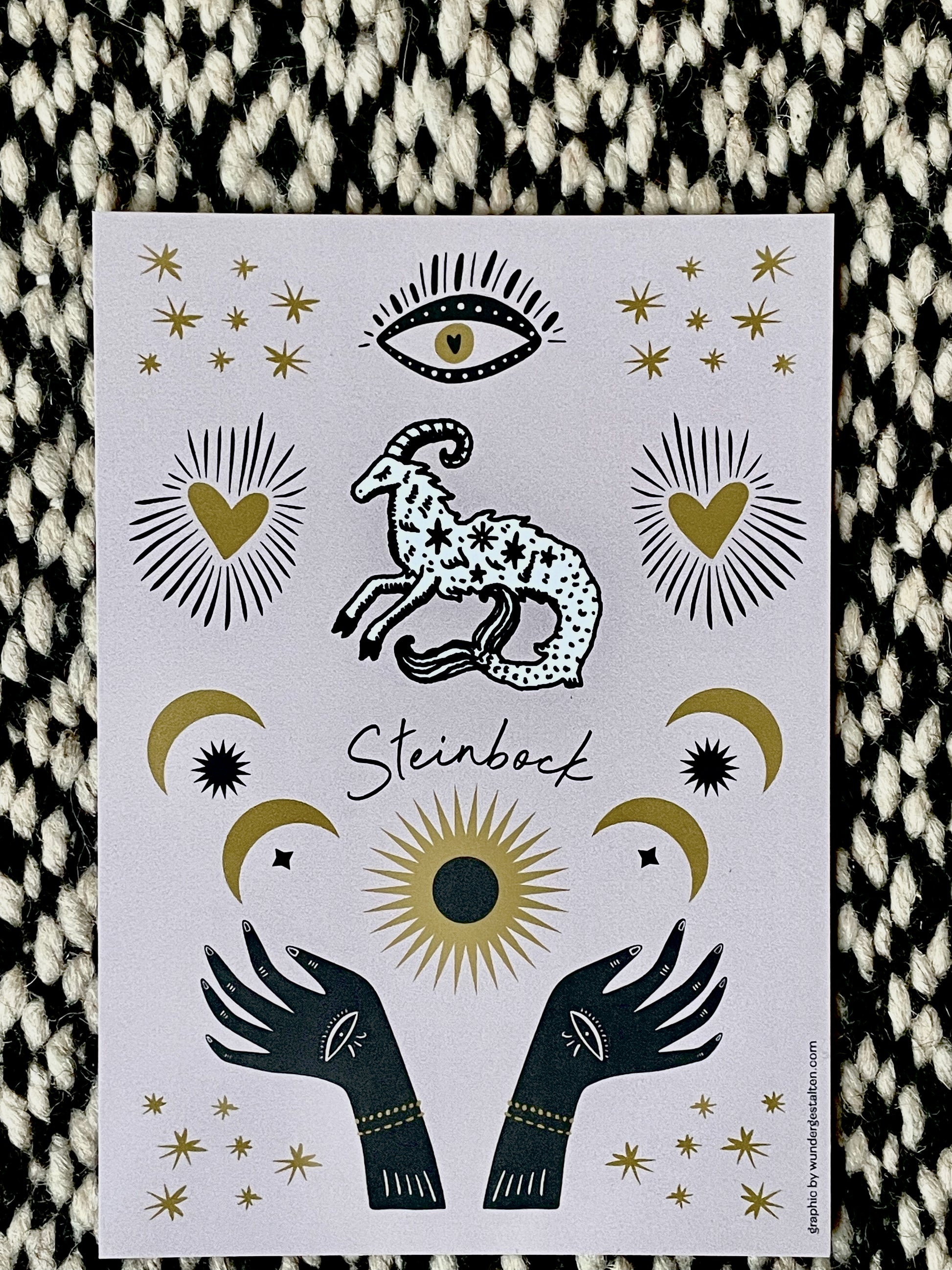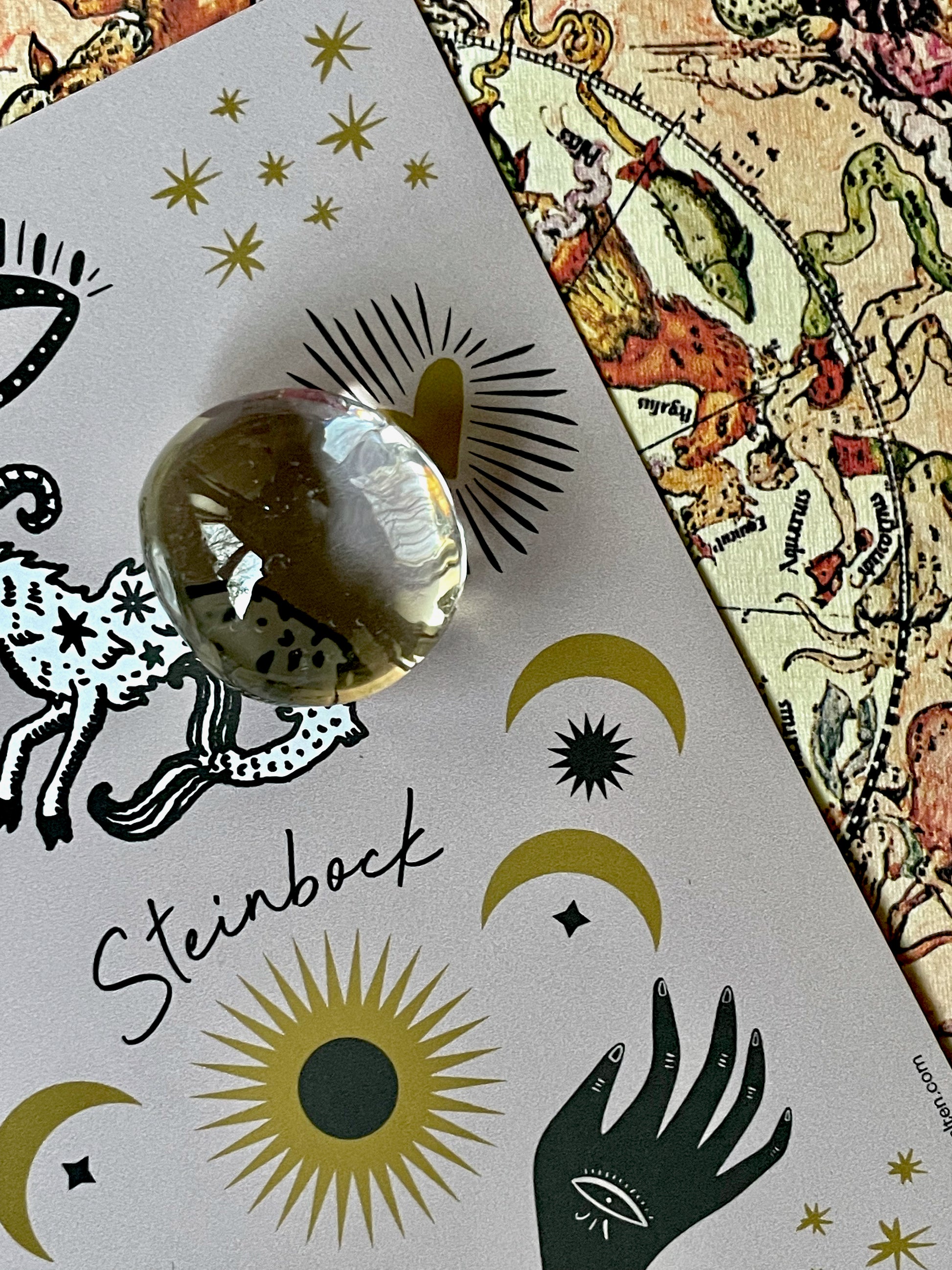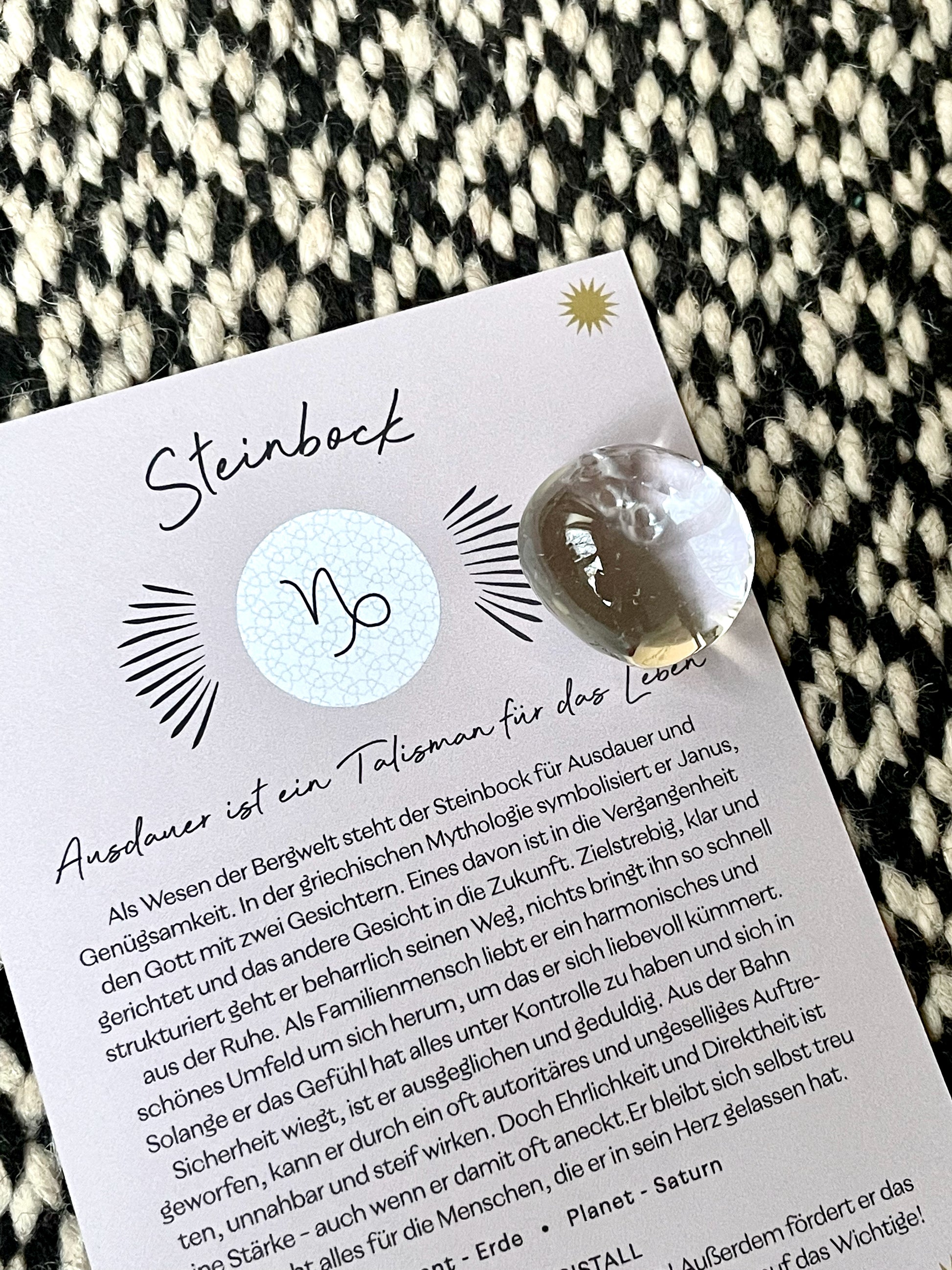 Ein Bergkristall für die Steinbock-Energie, begleitet von einer wunderhübsch illustrierten Karte mit den Charaktereigenschaften des Steinbocks, der "Magie" des Steines und Pflegehinweise für den Halbedelstein.