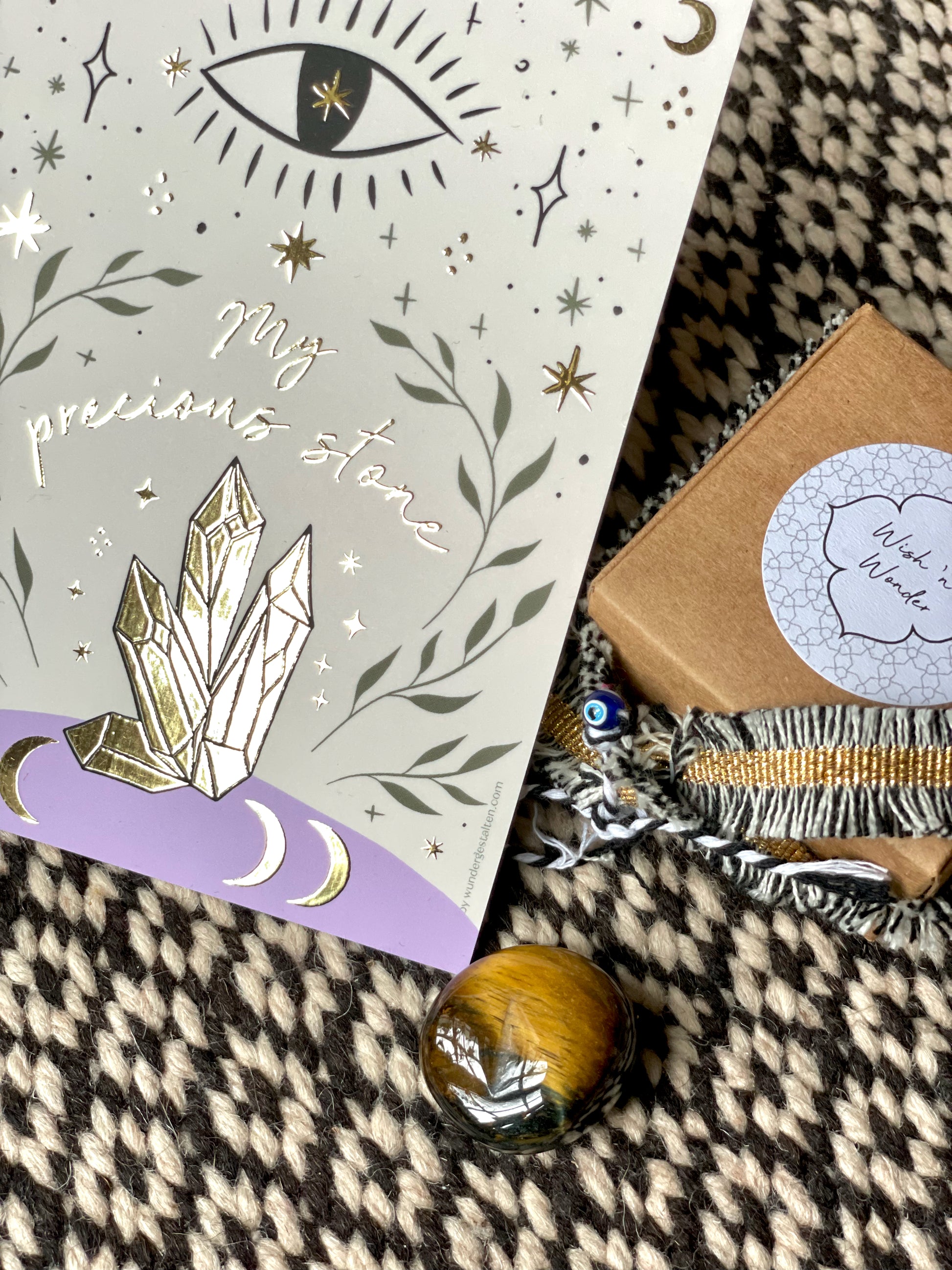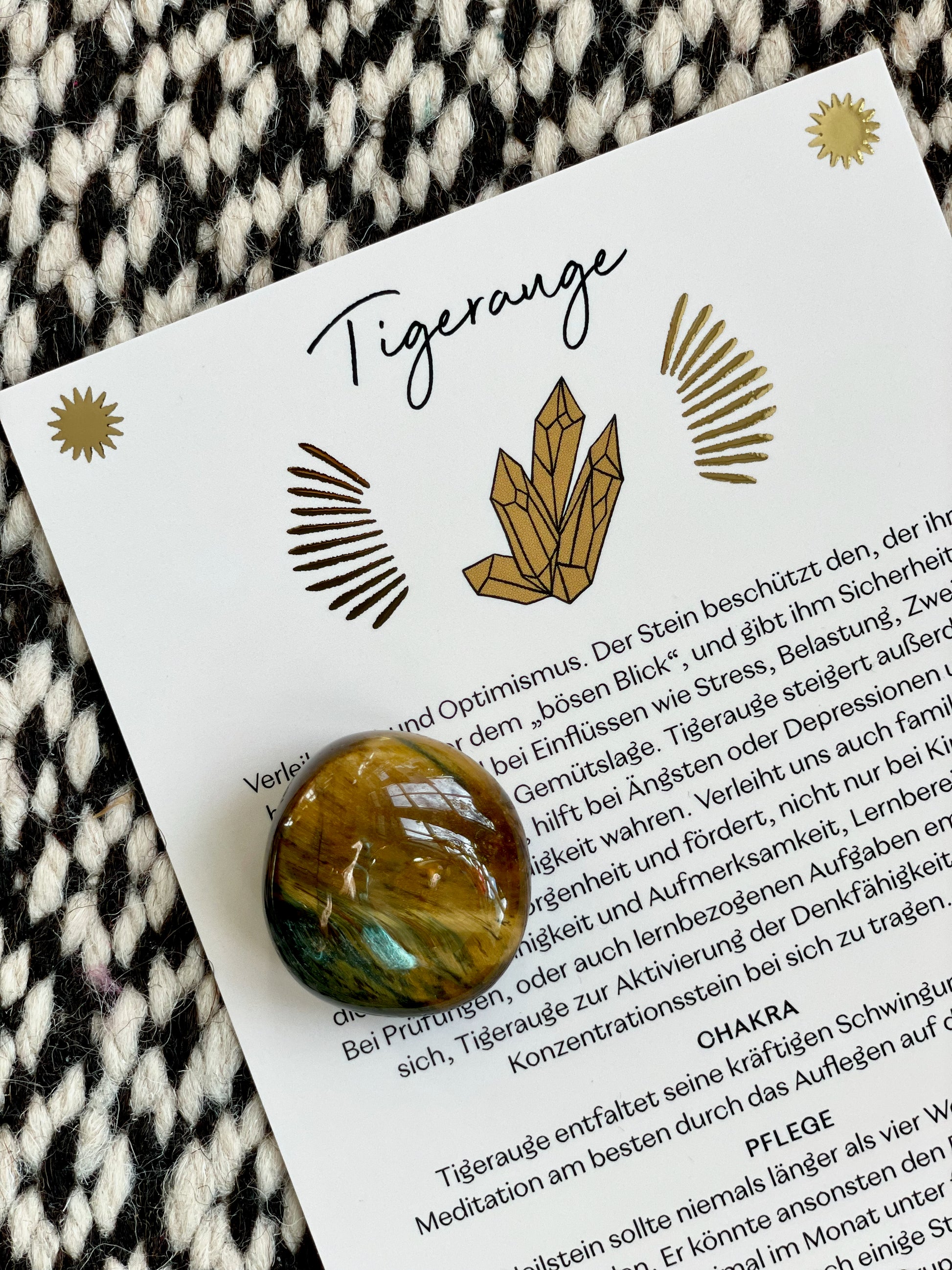 Ein Tigerauge persönlich ausgesucht, gereinigt und mit positiver Energie aufgeladen. Begleitet wird er von einer wunderhübsch illustrierten Karte mit den Eigenschaften - der "Magie" - des Steines und für welches Chakra er hauptsächlich eingesetzt wird. Zusätzlich findest Du auch Pflegehinweise für den Halbedelstein.