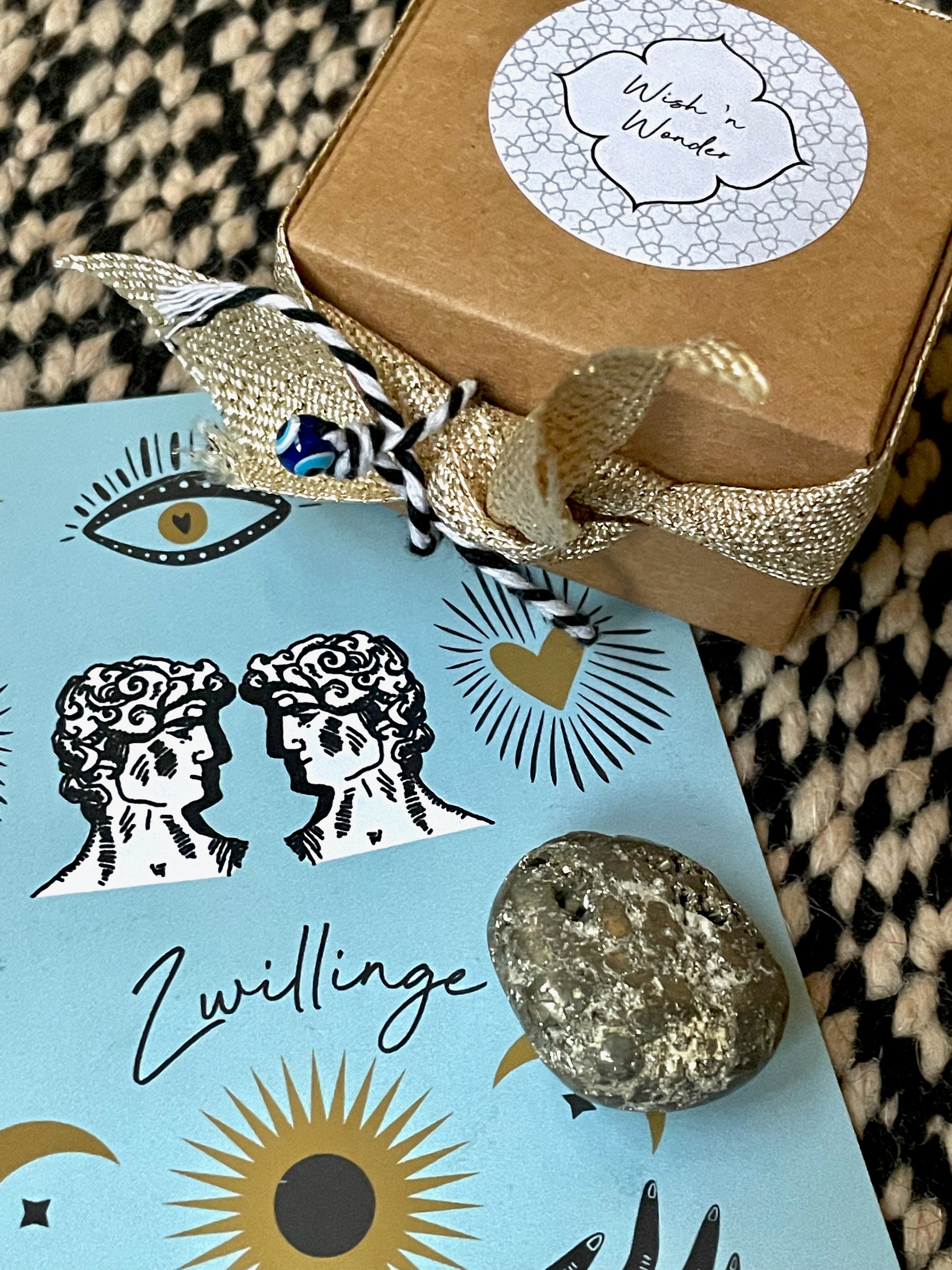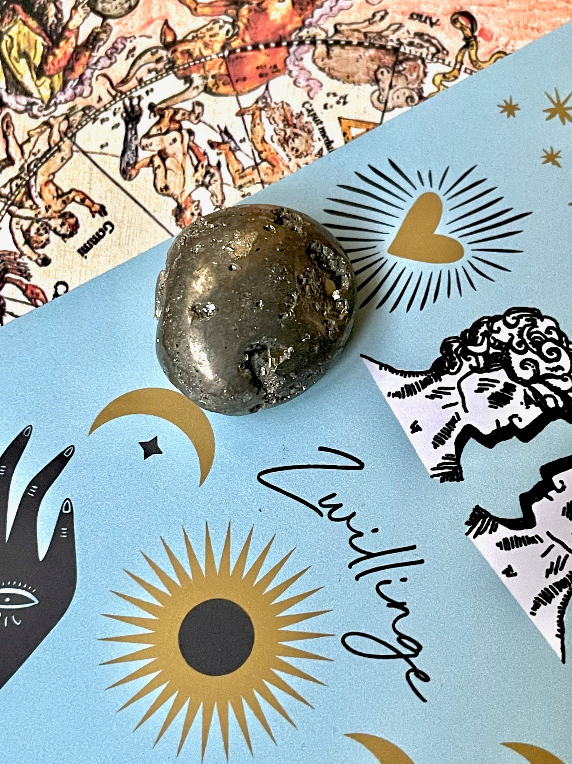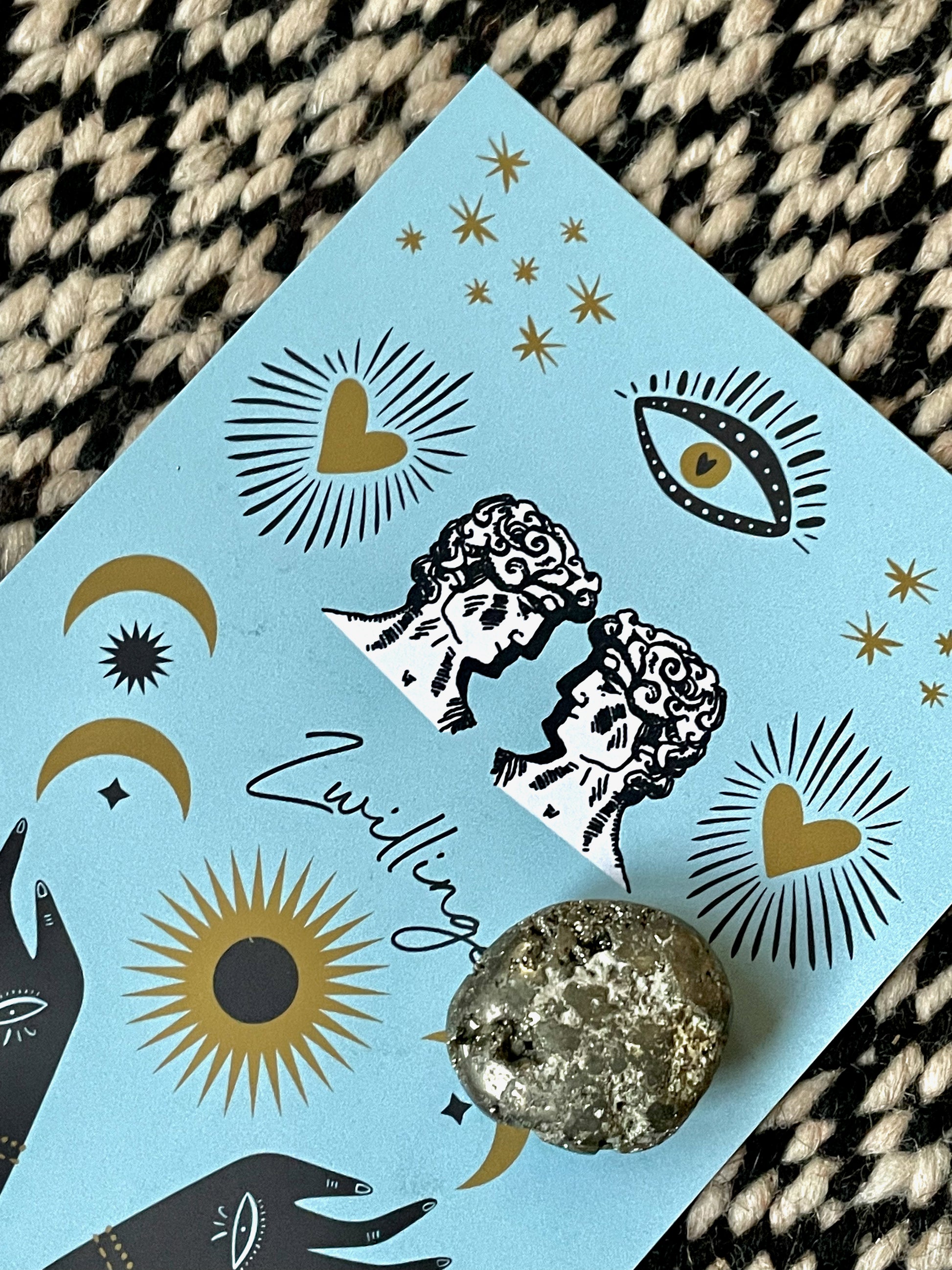 Ein Pyrit für die Zwilling-Energie, begleitet von einer wunderhübsch illustrierten Karte mit den Charaktereigenschaften des Zwillings, der "Magie" des Steines und Pflegehinweise für den Halbedelstein.